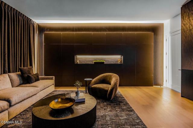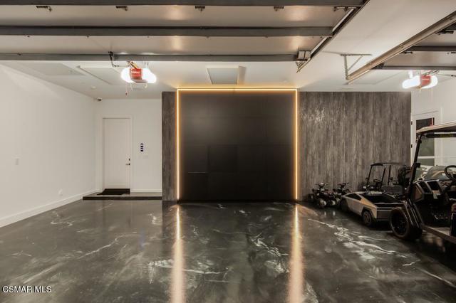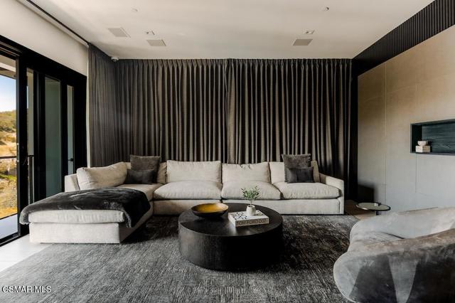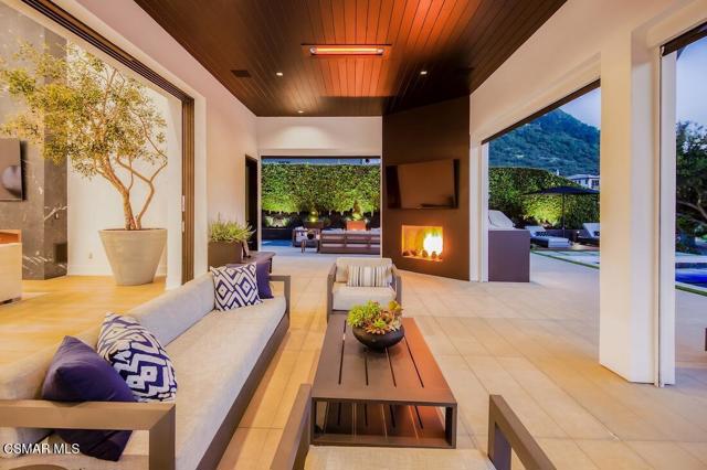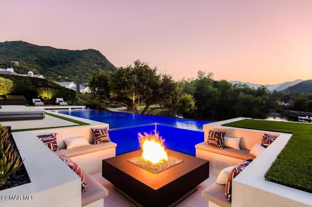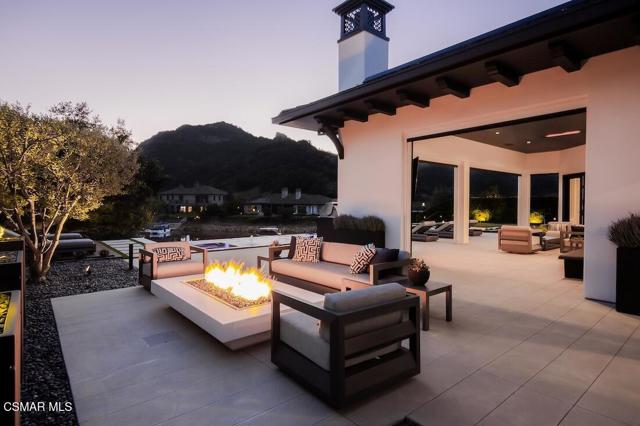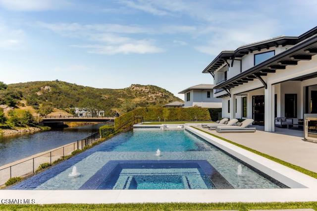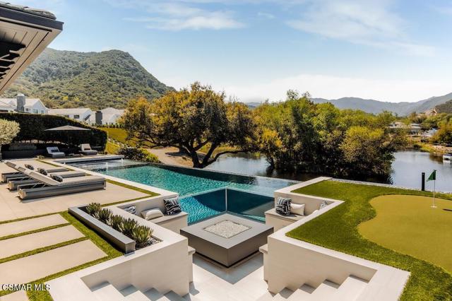 Located on the coveted shoreline of Lake Sherwood within one of Southern California's most exclusive guard-gated communities, this exceptional lakefront estate blends modern architecture, privacy, and refined luxury with sweeping water views and a private dock. Meticulously maintained and completely move-in ready, the home offers an extraordinary lakeside lifestyle.A dramatic basalt driveway leads to a floating walkway with custom scuppers, creating a tranquil arrival defined by the soothing sound of water. Inside, soaring ceilings and expansive pocket doors open seamlessly to a spectacular outdoor setting featuring an approximately 53-foot infinity-edge pool and spa with multiple water jets and a commercial-grade heater. A striking recessed fire pit lounge with acrylic glass offers captivating views directly into the pool, enhancing the home's seamless indoor-outdoor entertaining experience overlooking the lake.The great room is anchored by a dramatic 20-foot black marble fireplace wall, serving as a bold architectural centerpiece, while the residence features three fireplaces, adding warmth and ambiance throughout.The main-level primary suite is a private retreat, complete with a linear fireplace, heated floors, a spa-inspired steam shower, and dual custom closets with integrated LED lighting and glass shelving.The home is fully integrated with Savant smart home technology, including a Savant intercom system, Lutron lighting, electric shades throughout the interior and select exterior spaces, under-cabinet LED lighting, and comprehensive interior and exterior security cameras. A premium Sonos audio system provides seamless, high-quality sound throughout both the interior and exterior living spaces. A large Tesla solar system with backup batteries further enhances energy efficiency.