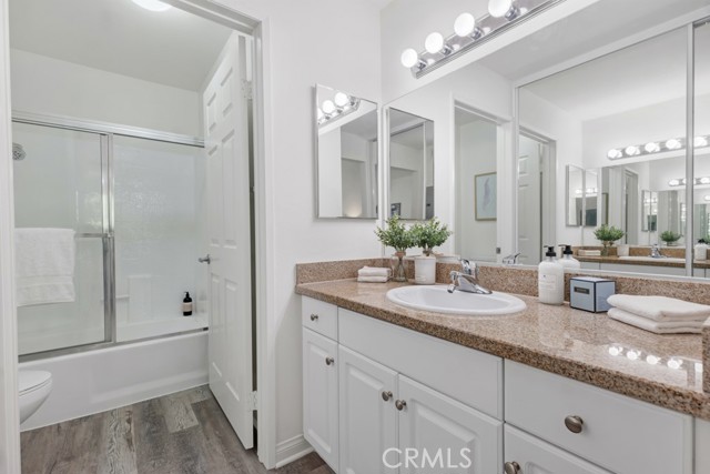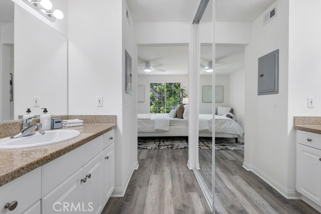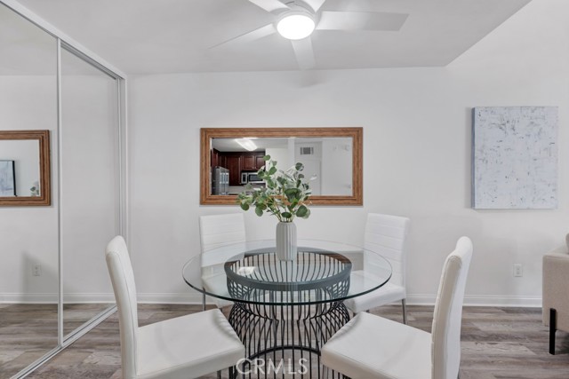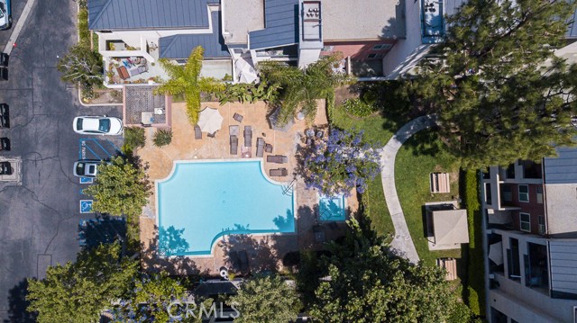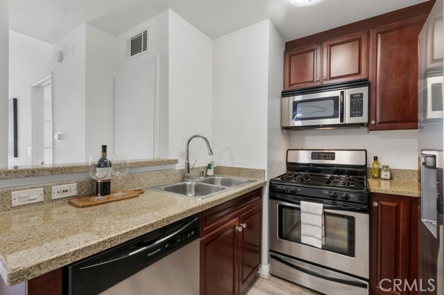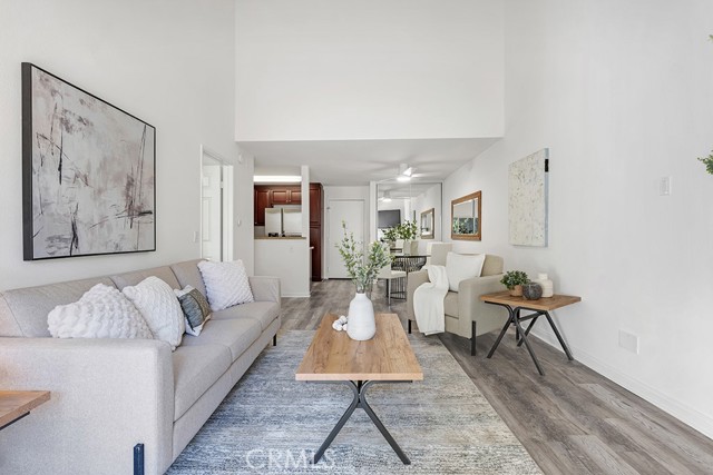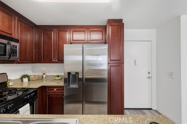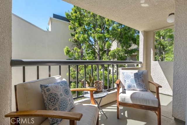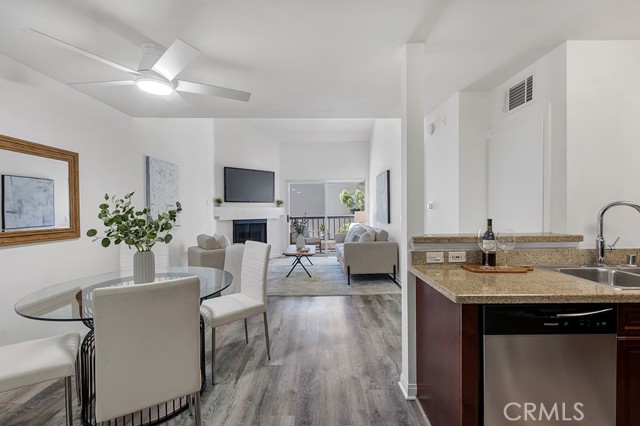 Welcome to this stunning 3rd floor corner unit at the highly sought-after MET community in Woodland Hills. This stunning unit features soaring vaulted ceilings, clean crisp architectural lines, and an abundance of natural light. Spanning approximately 610 sq ft, this thoughtfully designed 1-bedroom, 1-bathroom condo lives larger than its footprint thanks to an open-concept layout that seamlessly connects the living, dining, and kitchen areas. The well-appointed kitchen features rich cherry wood cabinetry, granite countertops, and a full suite of stainless steel appliances including a gas range and French door refrigerator perfect for everyday cooking and entertaining. The inviting living room centers around a cozy fireplace and opens via sliding glass doors to a private balcony with peaceful treetop and courtyard views, ideal for morning coffee or winding down in the evening. The generously sized primary bedroom offers hardwood-style flooring, a ceiling fan, and a large window framing lush greenery, complemented by an en-suite bath with granite vanity and tub/shower combo. Adding exceptional value, this unit comes with a rare 3 dedicated parking spaces, a truly standout feature in any HOA community. Residents of the gated MET enjoy resort-style amenities including a pool, spa and a fitness center, all just moments from Ventura Boulevard's dining and shopping, Warner Center, and easy 101 freeway access.