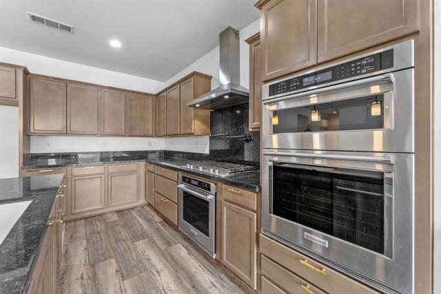 Stratford Place home built by PulteGroup—just 3 years old! This expansive single-story residence offers over 3,300 square feet of functional living space, featuring 5 bedrooms, a dedicated office or optional 6th bedroom, and 3 full bathrooms. Situated at the end of a quiet cul-de-sac on a quarter-acre premium lot, there is ample room for an ADU or future outdoor improvements. The home features an open-concept floor plan with vinyl plank flooring throughout the main living areas. Additional upgrades include a central vacuum system and whole-house soft water filtration. The kitchen is well-appointed with granite countertops, abundant cabinetry, double ovens, stainless KitchenAid appliances, a convenient pot filler above the range, and a large center island—ideal for entertaining and everyday use. A secondary primary suite provides flexibility for multi-generational living or guests. The three-car garage includes a mini-split system, offering versatility for a gym, workshop, or workspace, along with a built-in garage door screen. The backyard is flat and usable with low-maintenance turf and vinyl fencing, offering a blank canvas for a pool or custom outdoor space. Additional features include a separate laundry room, leased solar for energy efficiency, and no HOA. Short sale—subject to lender approval. Property offers strong potential with equity but will require repairs, presenting an excellent opportunity for buyers to add value.