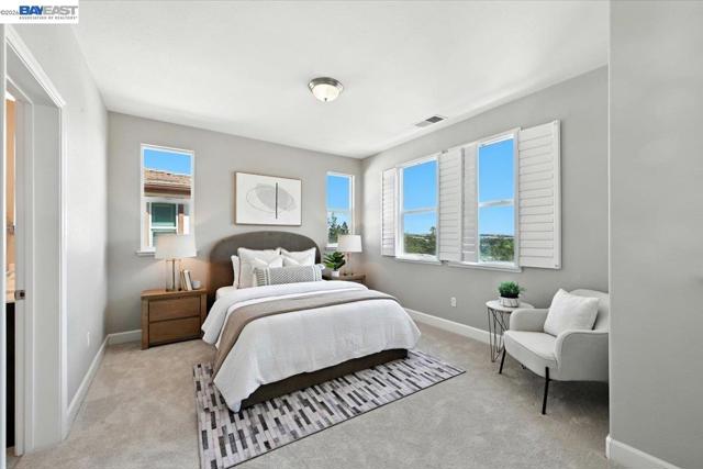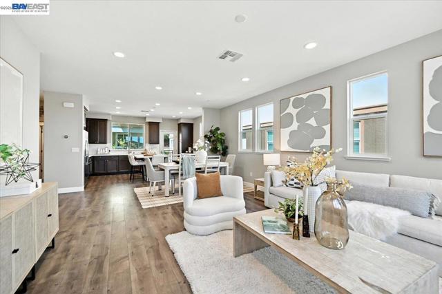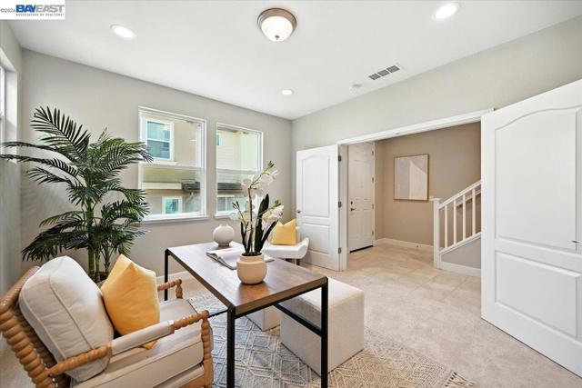 Welcome to 437 Ryan Terrace—an elegant tri-level corner townhome in the heart of San Ramon. This bright and spacious 3-bedroom + office, 3.5-bath home blends comfort and style with thoughtful designer touches throughout. The gourmet kitchen features a large quartz island, gas cooktop, stainless steel appliances, and abundant cabinetry. Enjoy luxury flooring in the main living areas, brand-new carpet upstairs, and smart dual-zone climate control. Start your mornings on the private balcony, then unwind on the serene top floor, where the primary suite offers dual vanities, a custom walk-in closet, and beautiful mountain views. Two additional bedrooms share a full bath, and the laundry room includes custom built-ins. The versatile ground-level office (no closet) comes with a full bath—perfect as a guest room, workspace, or media lounge. Additional highlights include a tankless water heater, EV charging outlet, and a 2-car side-by-side garage. Located in a quiet, family-friendly community with easy access to I-680, shopping, and top-rated schools. A fantastic value in this sought-after neighborhood.