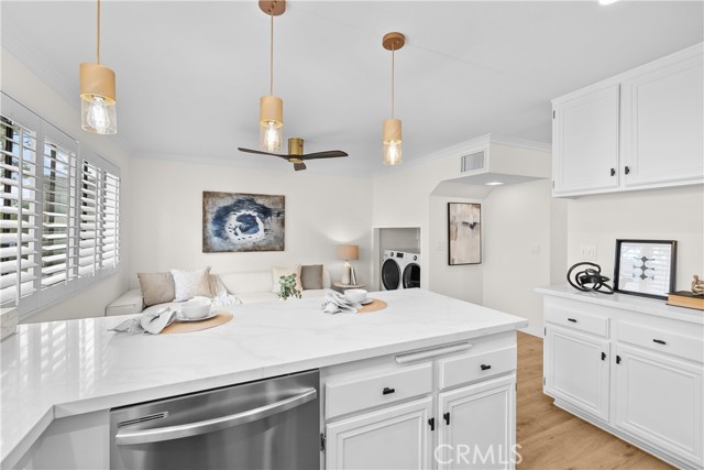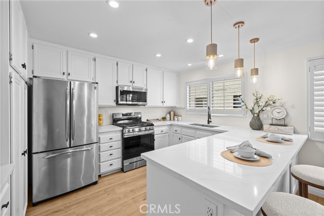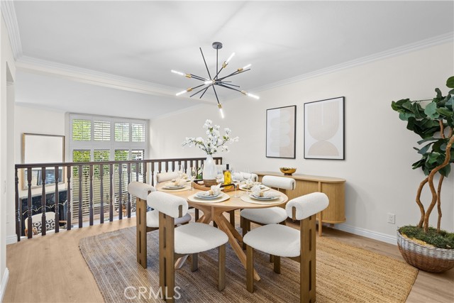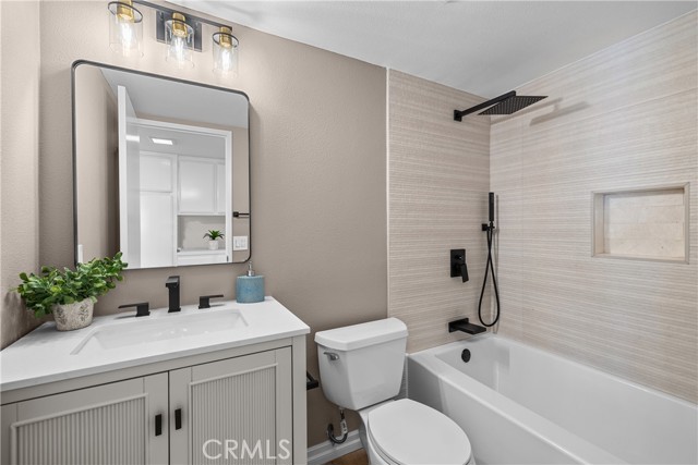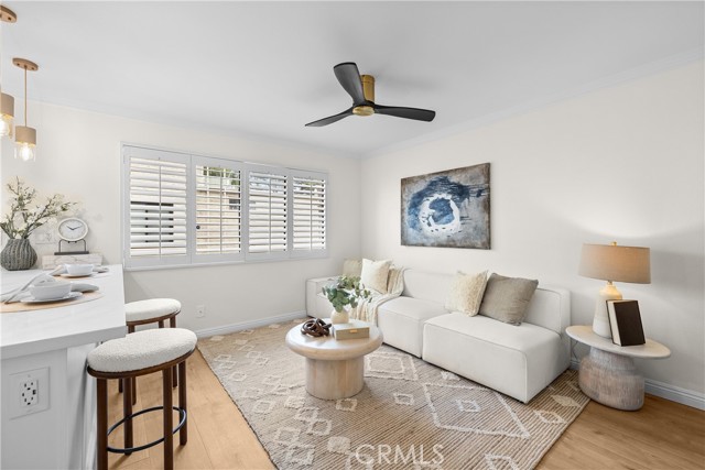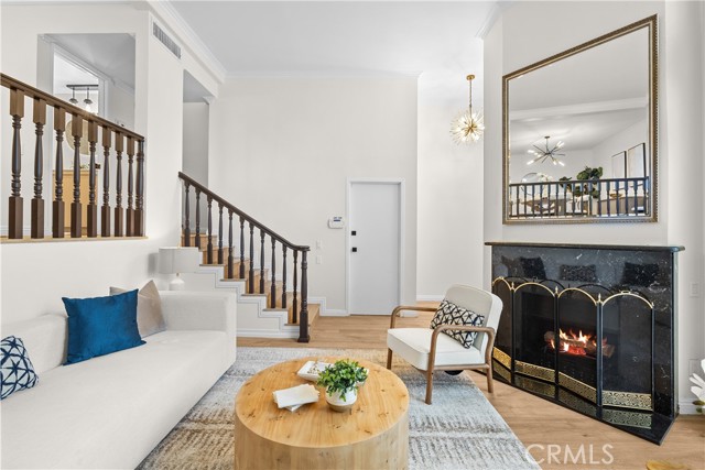 Gorgeous, remodeled townhome in the serene Dove Creek community, offering over 1,750 square feet of living space with 3 bedrooms and 2.5 bathrooms. A grand double-door entry opens to a spacious living room with soaring two-story ceilings, a cozy fireplace, and plantation shutters. Sliding glass doors fill the space with natural light and lead to a private patio—perfect for morning coffee or evening relaxation. An elevated dining area overlooks the living room and flows seamlessly into the kitchen and family room, creating an ideal layout for both everyday living and entertaining. The light-filled kitchen features quartz countertops, stylish pendant lighting, and stainless steel appliances, including a newer stove and microwave. Adjacent, the family room offers a comfortable space to gather or unwind. Upstairs, a versatile loft with accordion doors provides the perfect option for a home office or third bedroom. The oversized primary suite boasts double-door entry, high ceilings, beautiful flooring, dual closets, and a private en-suite bath. The primary bathroom has been thoughtfully updated with a dual-sink vanity, modern lighting, updated mirrors, and a beautifully remodeled walk-in shower. Additional highlights include a tastefully remodeled powder room for guests and an updated hall bathroom with contemporary finishes. The secondary bedroom features a clean, neutral aesthetic. Private Double Car Garage with Automatic Opener and Direct Access. Central Air & Heat. Residents of Dove Creek enjoy access to a pool, two spas, and a tennis court. Ideally located near shopping, dining, and entertainment at The Village, Westfield Topanga, and Ventura Boulevard, with convenient access to the 101 and 118 freeways.
