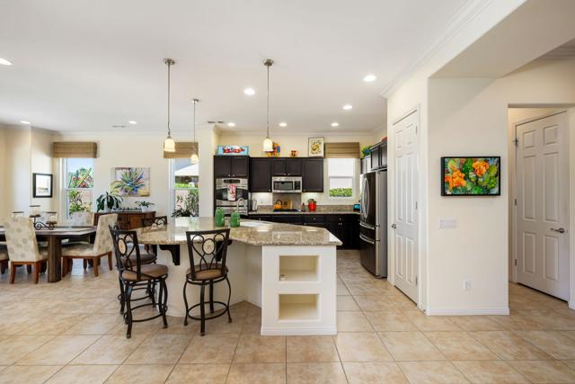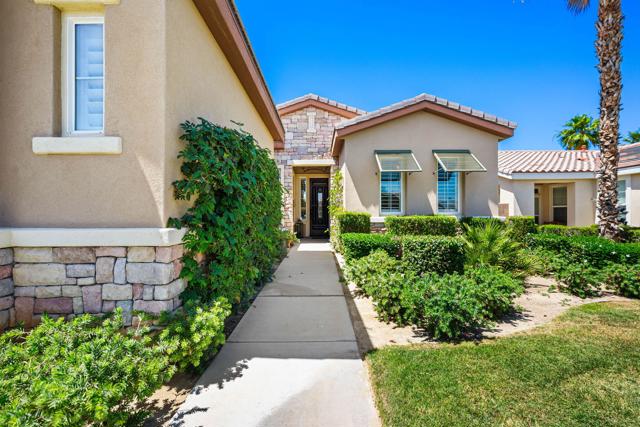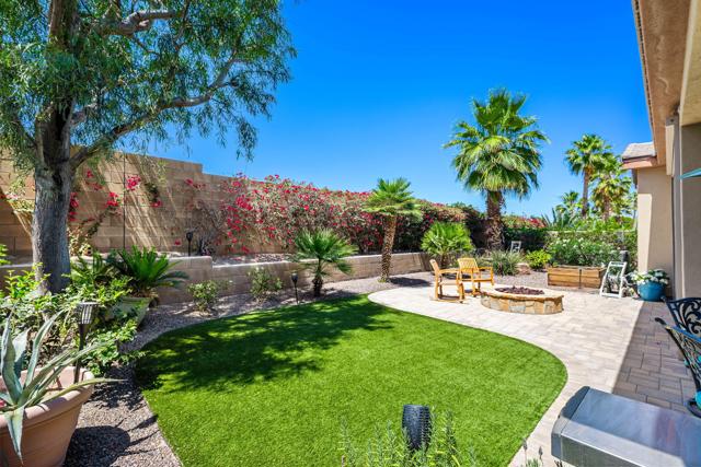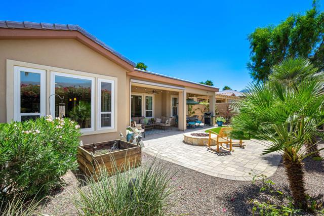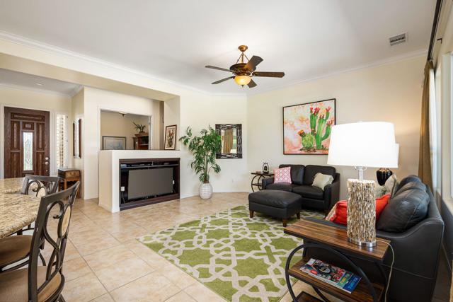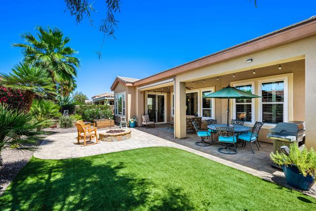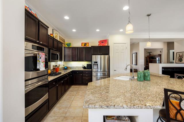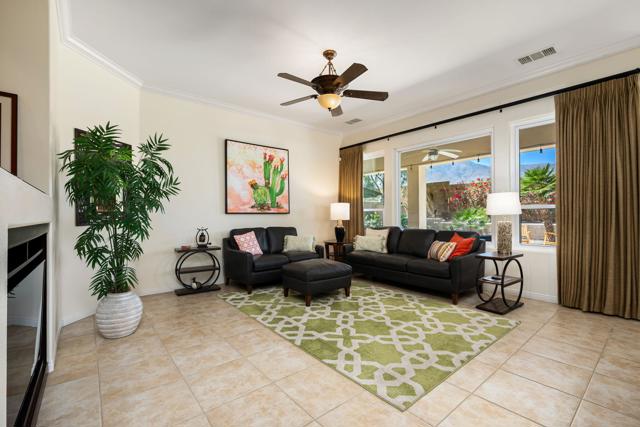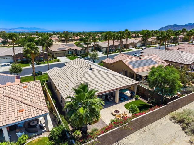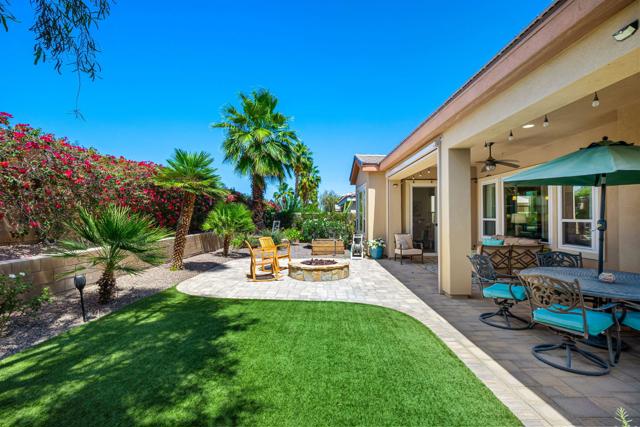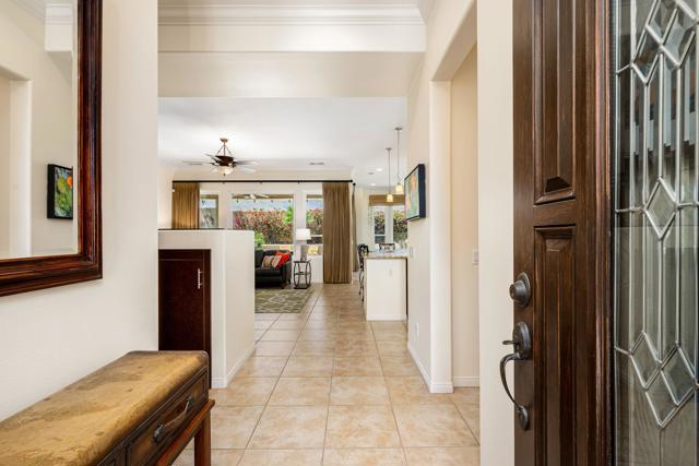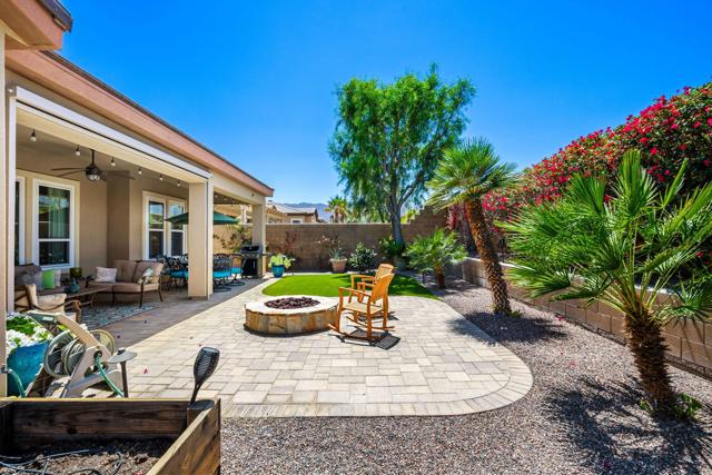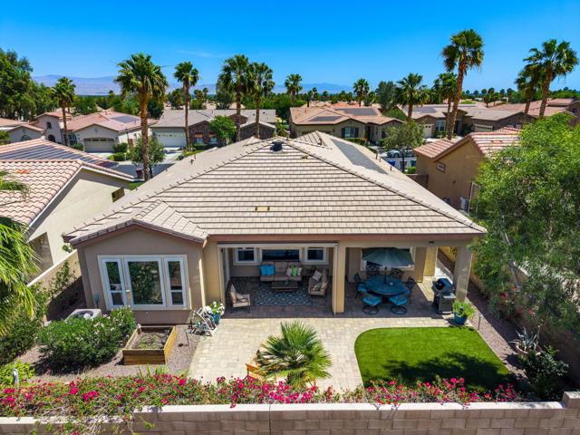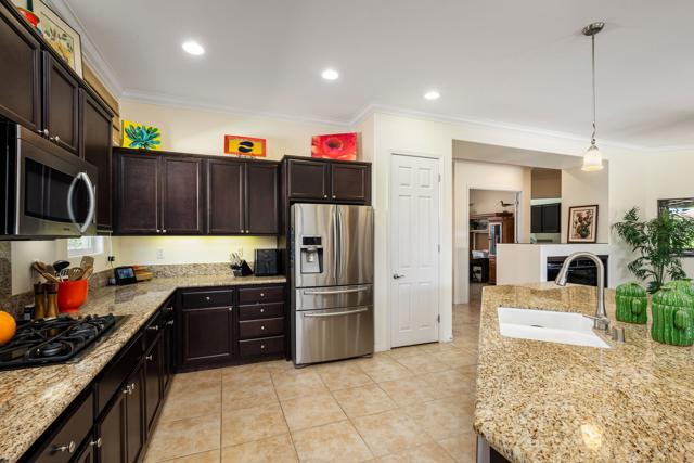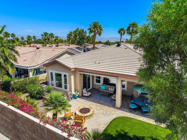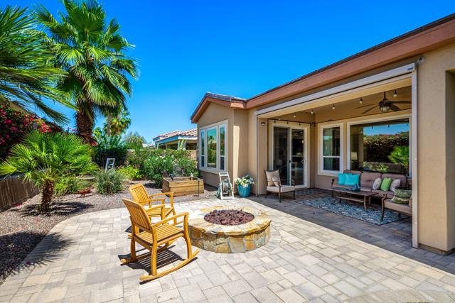 Meticulously maintained and absolutely captivating, this Caspian plan with a charming Tuscan facade, and stunning western mountain views is truly a standout. Offering approximately 1,775 square feet of thoughtfully designed living space, this residence features 2 bedrooms, 2 baths, and a versatile den/office easily convertible to a third bedroom. Elegant upgrades abound, including crown molding, plantation shutters and custom window coverings throughout. A striking etched-glass entry door welcomes you into a light-filled great room with a media niche, open-concept layout, and expansive windows that flood the home with natural light. The adjacent dining area flows seamlessly into a beautifully appointed chef's kitchen showcasing stainless steel appliances, built-in double ovens and microwave, gas cooktop, and a large prep island with pendant lighting and bullnose slab granite countertops, all complemented by rich espresso cabinetry with brushed nickel hardware and a convenient pantry. Guest quarters offer murphy bed for comfort and privacy with access to a full bath featuring a spacious tiled shower, while the primary suite serves as a serene retreat with dual vanities and a large glass-enclosed shower. Step outside to your private backyard oasis, complete with an expanded paver patio, covered outdoor living area, cozy fire pit, lush landscaping, and breathtaking mountain views. Ideally located just moments from the Santa Rosa Clubhouse and its world-class amenities, this exceptional home invites you to experience the best of Trilogy living--schedule your private showing today. Don't forget the extra garage bump out for the golf cart or storage.