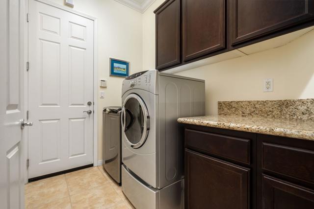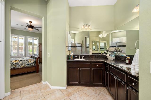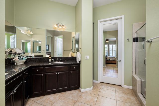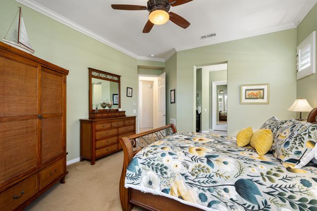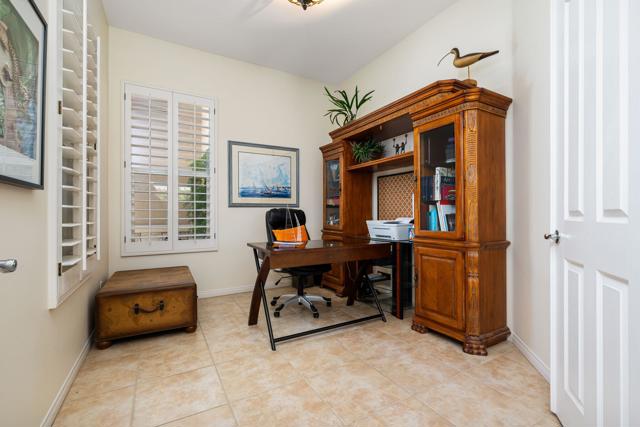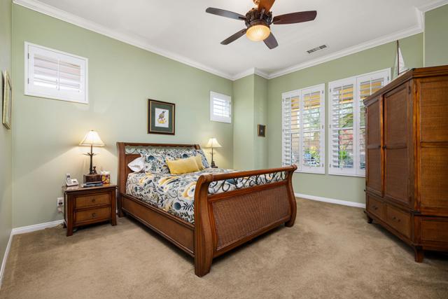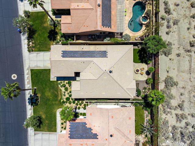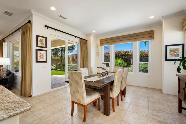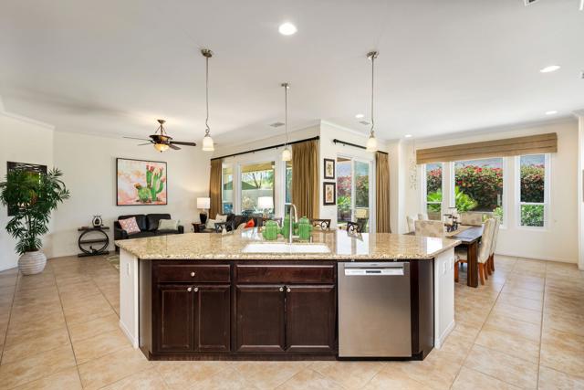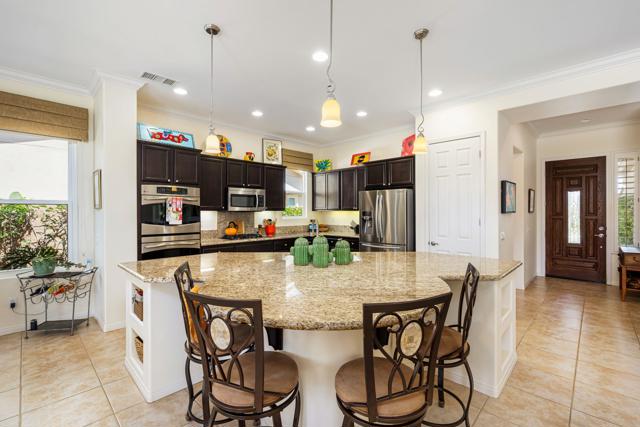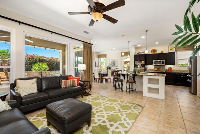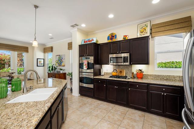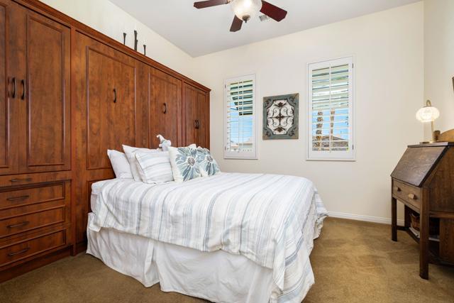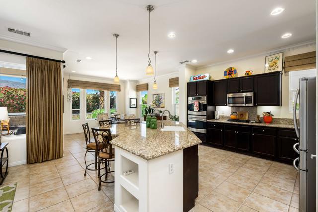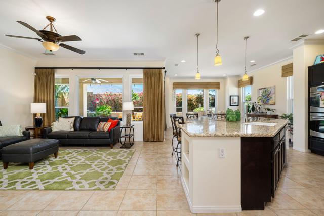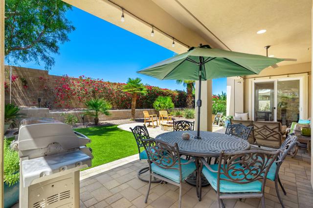 Meticulously maintained and absolutely captivating, this Caspian plan with a charming Tuscan facade, and stunning western mountain views is truly a standout. Offering approximately 1,775 square feet of thoughtfully designed living space, this residence features 2 bedrooms, 2 baths, and a versatile den/office easily convertible to a third bedroom. Elegant upgrades abound, including crown molding, plantation shutters and custom window coverings throughout. A striking etched-glass entry door welcomes you into a light-filled great room with a media niche, open-concept layout, and expansive windows that flood the home with natural light. The adjacent dining area flows seamlessly into a beautifully appointed chef's kitchen showcasing stainless steel appliances, built-in double ovens and microwave, gas cooktop, and a large prep island with pendant lighting and bullnose slab granite countertops, all complemented by rich espresso cabinetry with brushed nickel hardware and a convenient pantry. Guest quarters offer murphy bed for comfort and privacy with access to a full bath featuring a spacious tiled shower, while the primary suite serves as a serene retreat with dual vanities and a large glass-enclosed shower. Step outside to your private backyard oasis, complete with an expanded paver patio, covered outdoor living area, cozy fire pit, lush landscaping, and breathtaking mountain views. Ideally located just moments from the Santa Rosa Clubhouse and its world-class amenities, this exceptional home invites you to experience the best of Trilogy living--schedule your private showing today. Don't forget the extra garage bump out for the golf cart or storage.