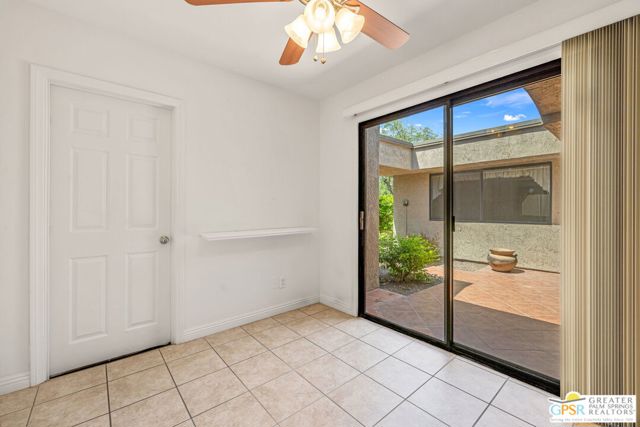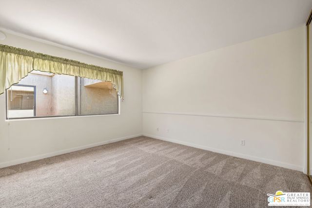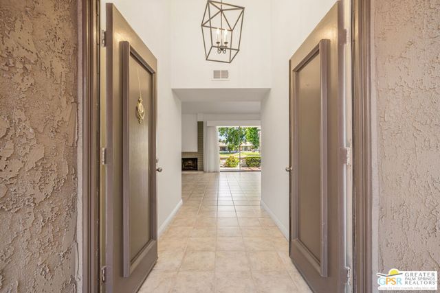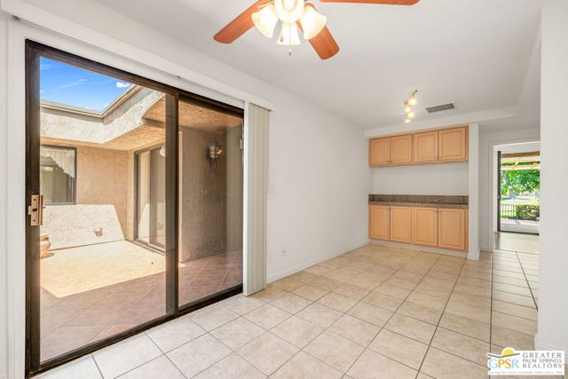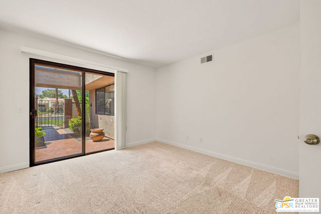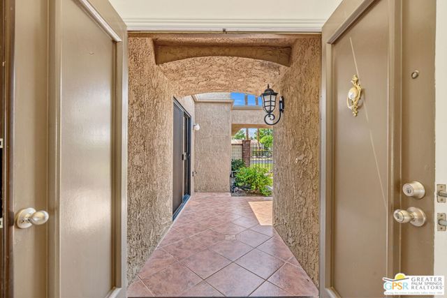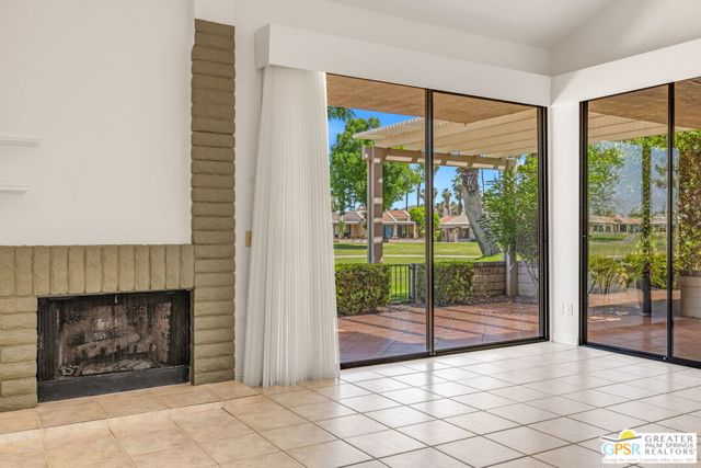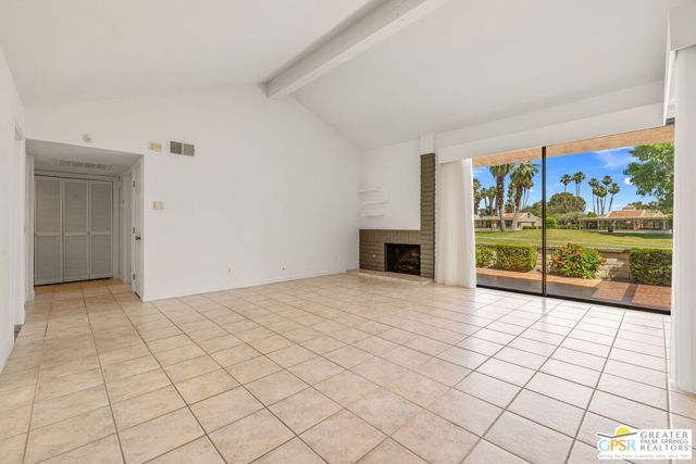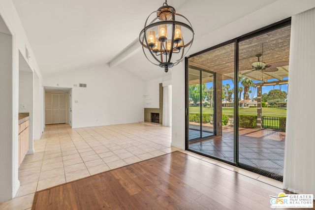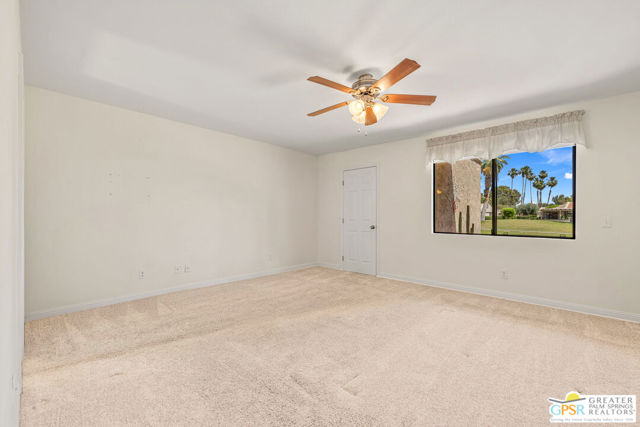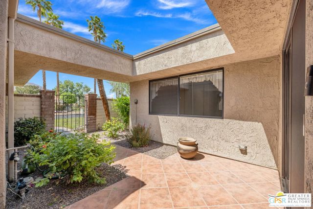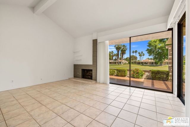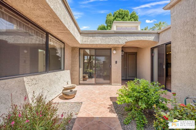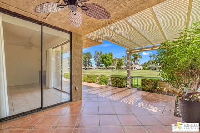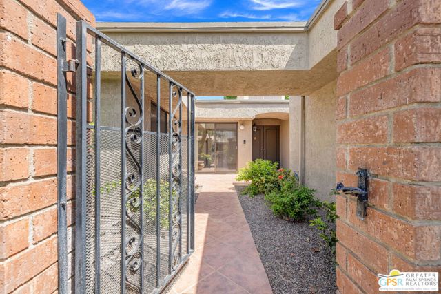 Fabulous setting! Strong value! A standout opportunity along a wide par 5 fairway at the West Gate of Cathedral Canyon Country Club in desirable South Palm Springs. Mountain views and golf course frontage set the tone, while two large patios take full advantage of the setting for outdoor living and entertaining. Inside, vaulted and beamed ceilings, fireplace, and wet bar elevate the light filled main living areas. The spacious kitchen with breakfast area opens to a private courtyard and offers generous workspace for everyday living. The primary suite features an expanded walk in closet and an updated bath. Guest suite offers comfort and separation, while the den or office opens to the courtyard for added flexibility. Skylights in both baths enhance the bright feel. Direct access to a two car garage. Pride of ownership is a theme with thoughtful updates throughout. Community pool and spa enjoy a beautiful setting and are nearby. Excellent South Palm Springs location close to the best of dining, shopping, and golf. Reasonable HOA fees plus land lease in place, contributing to overall value.