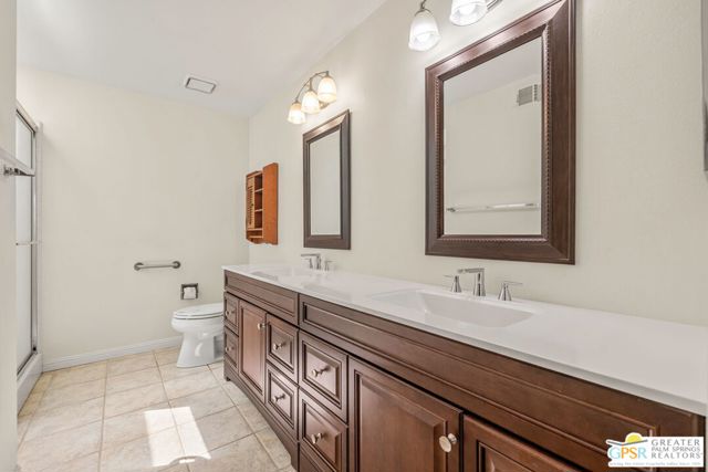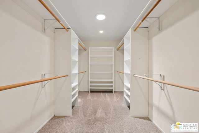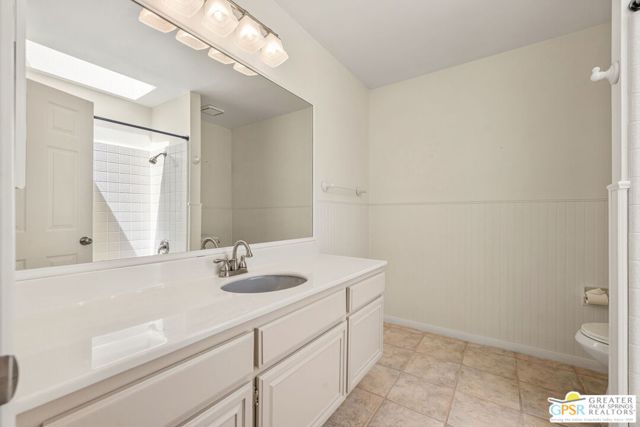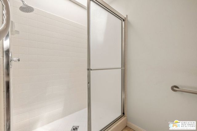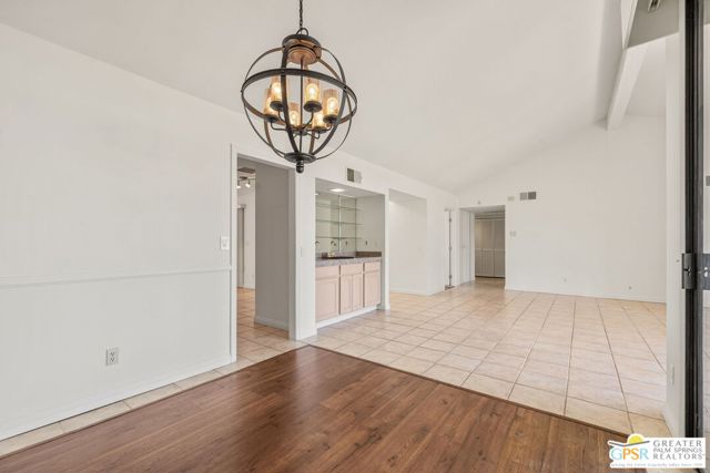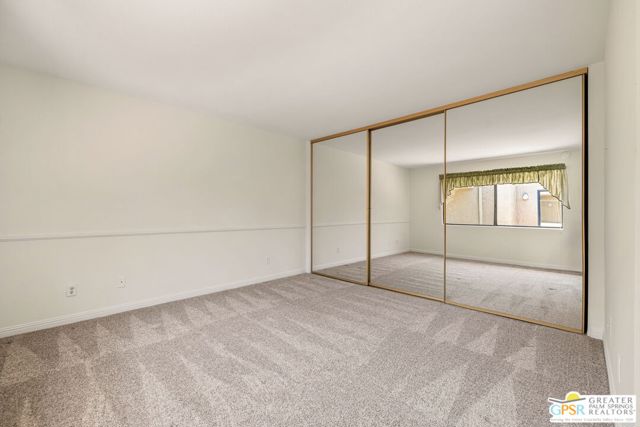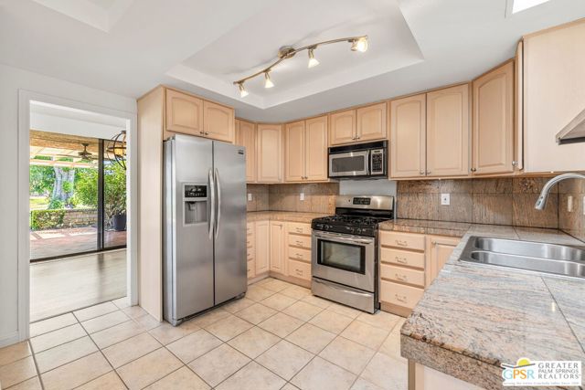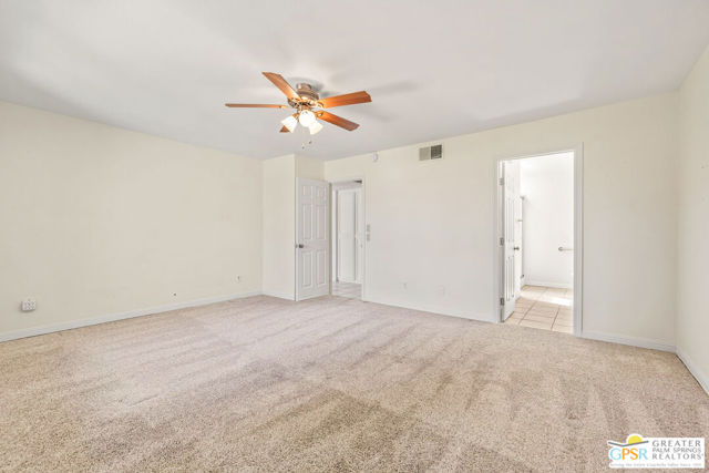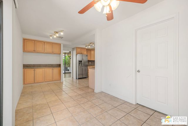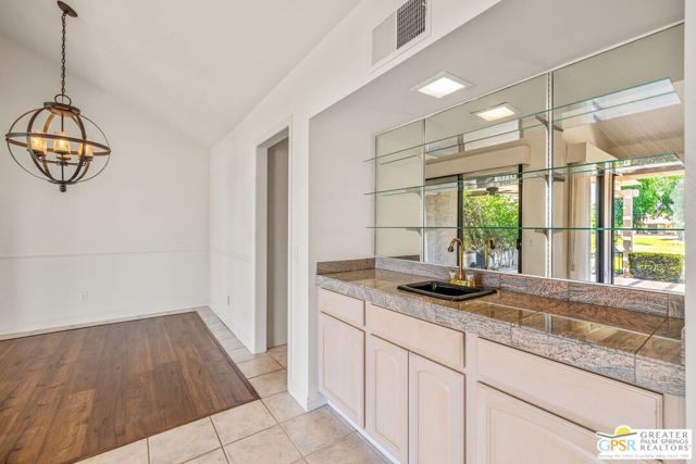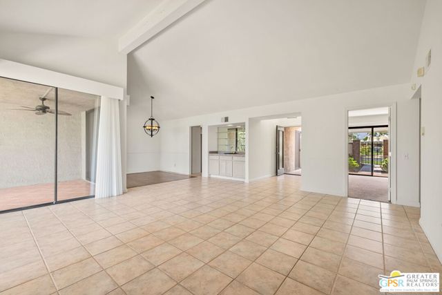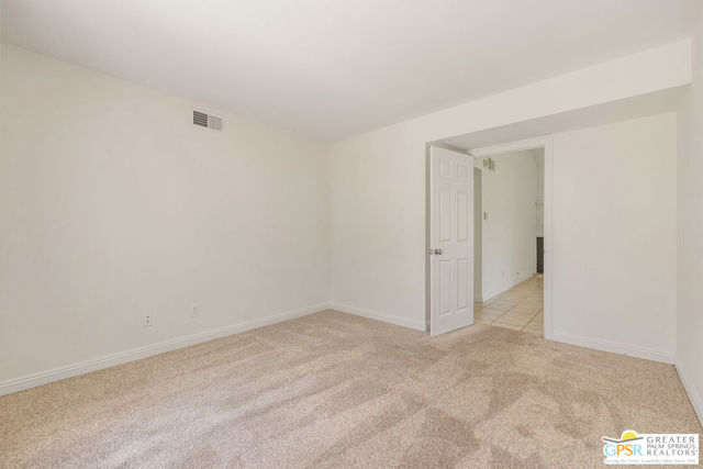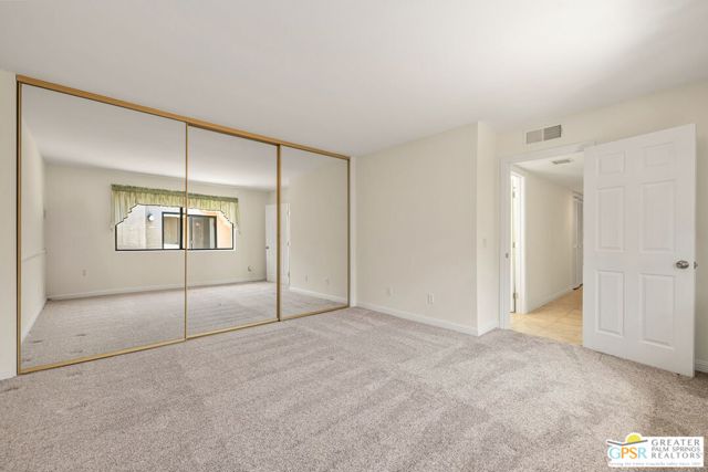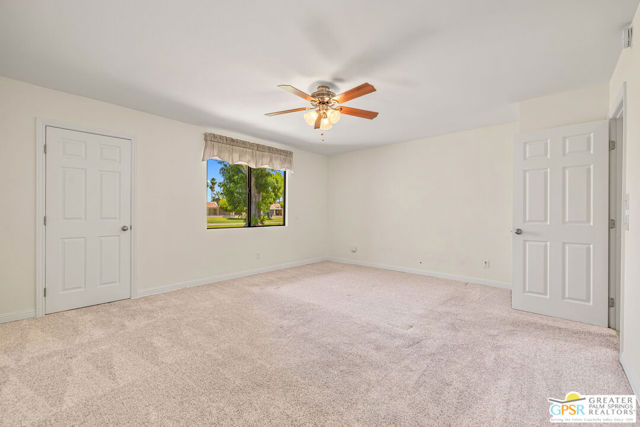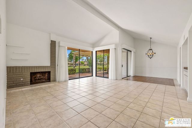 Fabulous setting! Strong value! A standout opportunity along a wide par 5 fairway at the West Gate of Cathedral Canyon Country Club in desirable South Palm Springs. Mountain views and golf course frontage set the tone, while two large patios take full advantage of the setting for outdoor living and entertaining. Inside, vaulted and beamed ceilings, fireplace, and wet bar elevate the light filled main living areas. The spacious kitchen with breakfast area opens to a private courtyard and offers generous workspace for everyday living. The primary suite features an expanded walk in closet and an updated bath. Guest suite offers comfort and separation, while the den or office opens to the courtyard for added flexibility. Skylights in both baths enhance the bright feel. Direct access to a two car garage. Pride of ownership is a theme with thoughtful updates throughout. Community pool and spa enjoy a beautiful setting and are nearby. Excellent South Palm Springs location close to the best of dining, shopping, and golf. Reasonable HOA fees plus land lease in place, contributing to overall value.