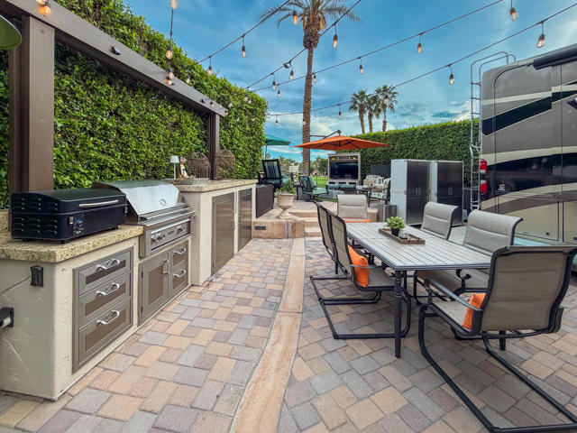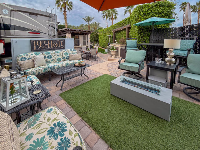 This exceptional Class A motorcoach RV lot at Outdoor Resort Indio offers a rare oversized layout, excellent parking, and a thoughtfully designed setting ideal for entertaining and pet-friendly resort living. Spanning approximately 3,484 square feet, the lot showcases a large raised rear patio with sweeping golf course views, creating a private and dramatic outdoor living space seldom found within the resort.The main living area is anchored by an Alumawood pergola with wraparound electric screens, ceiling heaters, and a fan, and is complemented by a well-appointed outdoor kitchen featuring granite countertops, stainless appliances, a full-size refrigerator, dishwasher, cooktop, oven, pull-out trash, generous storage, a hot water heater, and bar seating. A separate rear outdoor kitchen frames a central patio accented with cafe lighting, forming an inviting focal point for evening gatherings, and includes additional storage plus a hidden, enclosed washer and dryer.Finished entirely with pavers, the lot offers multiple seating and entertaining zones, including a raised back porch with extensive seating and an outdoor TV cabinet, a large dining table with eight chairs, a lounge area with sofa and six chairs, and a welcoming fire table at the front of the lot. A very large grass area enhances the lot's appeal for pet owners, while mature, private landscaping, a rock fountain, and a metal art cactus with integrated tiki torches add distinctive character and ambiance. With exceptional parking capacity, privacy, and a truly oversized footprint, this lot delivers an outstanding blend of space, comfort, and luxury resort-style living--perfect for hosting, relaxing, and enjoying desert evenings at their best.Furniture and golf cart included.Outdoor Resort Indio is a Class A RV only resort.