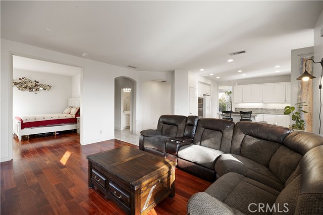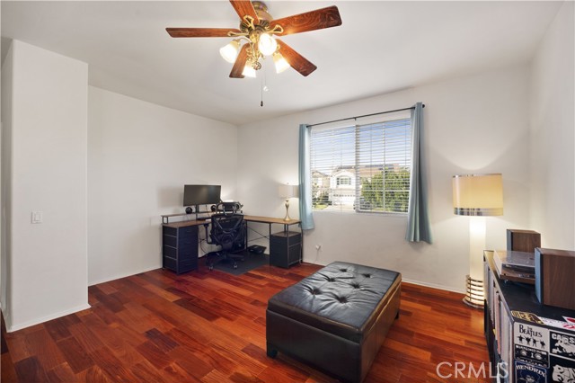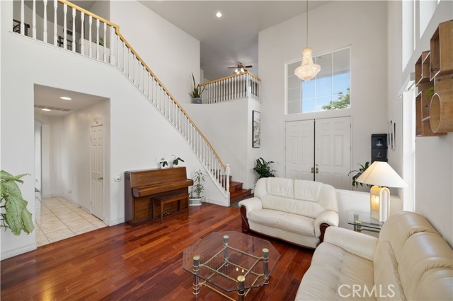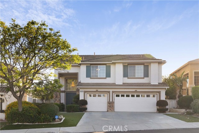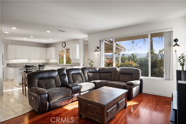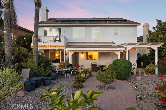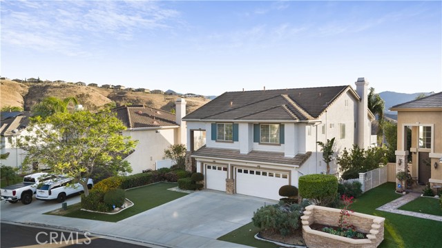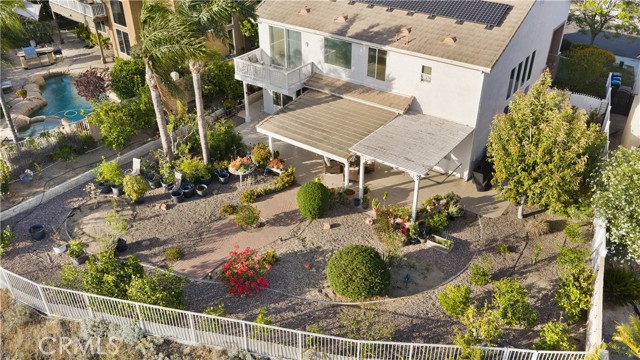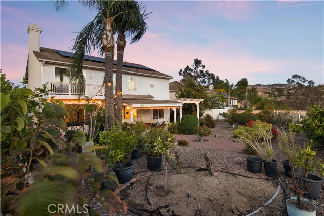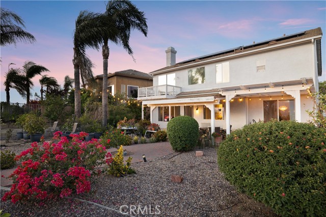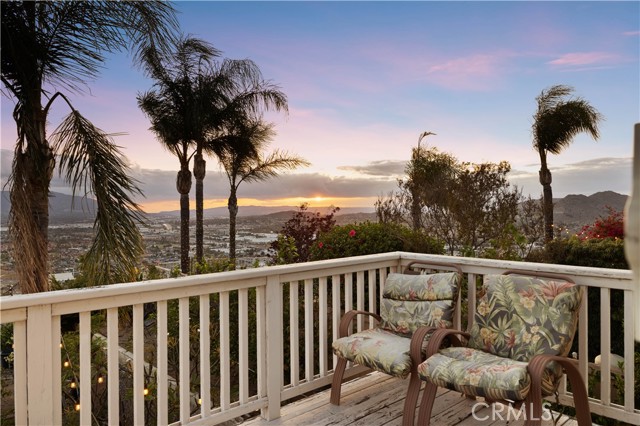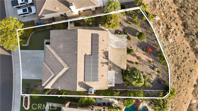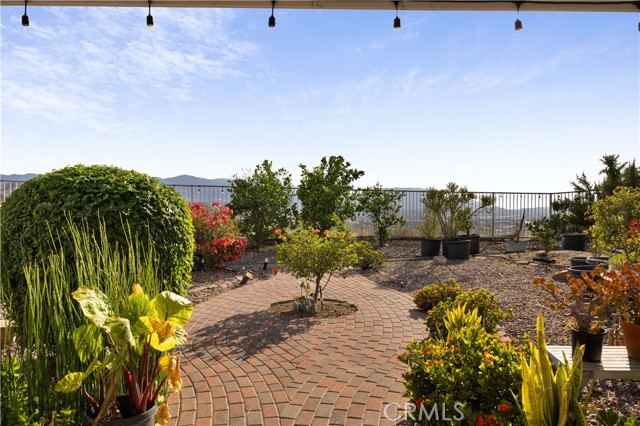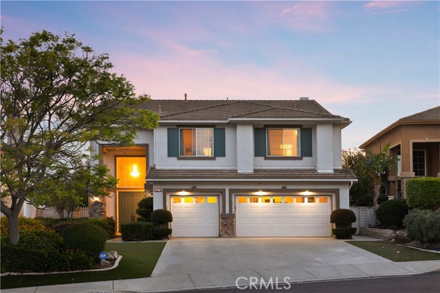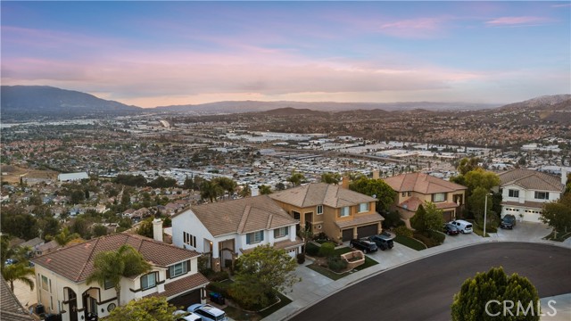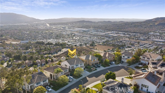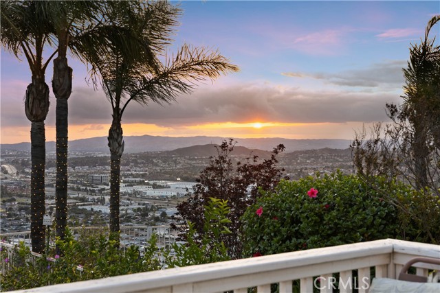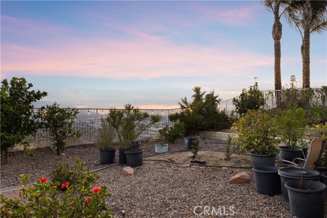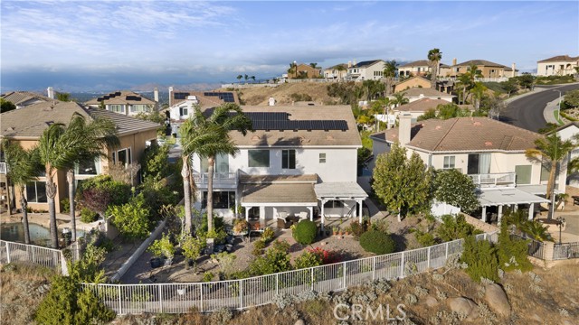 Panoramic city light and sunset views. Southwest-facing backyard. Fully paid-off solar. Over 40 fruit trees. Welcome to one of the finest view lots in all of Lake Hills Reserve. Perched at 1,160 feet elevation at a quiet cul-de-sac, this exceptional 4 bedroom, 4 bathroom home offers approximately 2,974 square feet of comfortable living space on an expansive 9,583 square foot lot — delivering the space, privacy, and breathtaking views that are increasingly hard to find in Southern California. Step inside to soaring cathedral ceilings and an open floor plan that immediately creates a sense of light and space. The kitchen features quartz countertops, stainless steel appliances, a center island, and recessed lighting — flowing naturally into the warm, inviting family room with a fireplace. Upstairs, the primary suite is a true retreat with a walk-in closet, dual vanities, soaking tub, separate shower, and a private balcony perfectly positioned to capture sweeping city and sunset views. Three additional bedrooms offer flexibility for family, guests, or a home office, complemented by a full bathroom and a convenient jack-and-jill bathroom shared between two of the bedrooms. Outside is where this home truly earns its place. The southwest-facing backyard sits at 1,160 feet elevation — meaning every evening brings a front-row seat to golden sunsets and glittering city lights stretching across the entire Riverside valley. A covered patio and one of the largest lots in the community create an outdoor sanctuary. The backyard also features a remarkable private orchard of over 40 fruit trees including cherimoya, mango, pomelo, orange, peach, Asian pear, lemon, kalamansi, and moringa — a true farm-to-table paradise that makes everyday living feel like something special. Conveniently located with easy access to the 91 Freeway, Galleria at Tyler shopping and dining, and within the Riverside Unified School District. Homes with this view, this lot, and this lifestyle don't come along often.